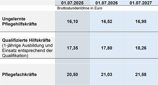 Für Pflegefachkräfte steigt das Mindestentgelt von derzeit 20,50 € brutto je Stunde, über 21,03 € brutto je Stunde auf 21,58 € brutto je Stunde.